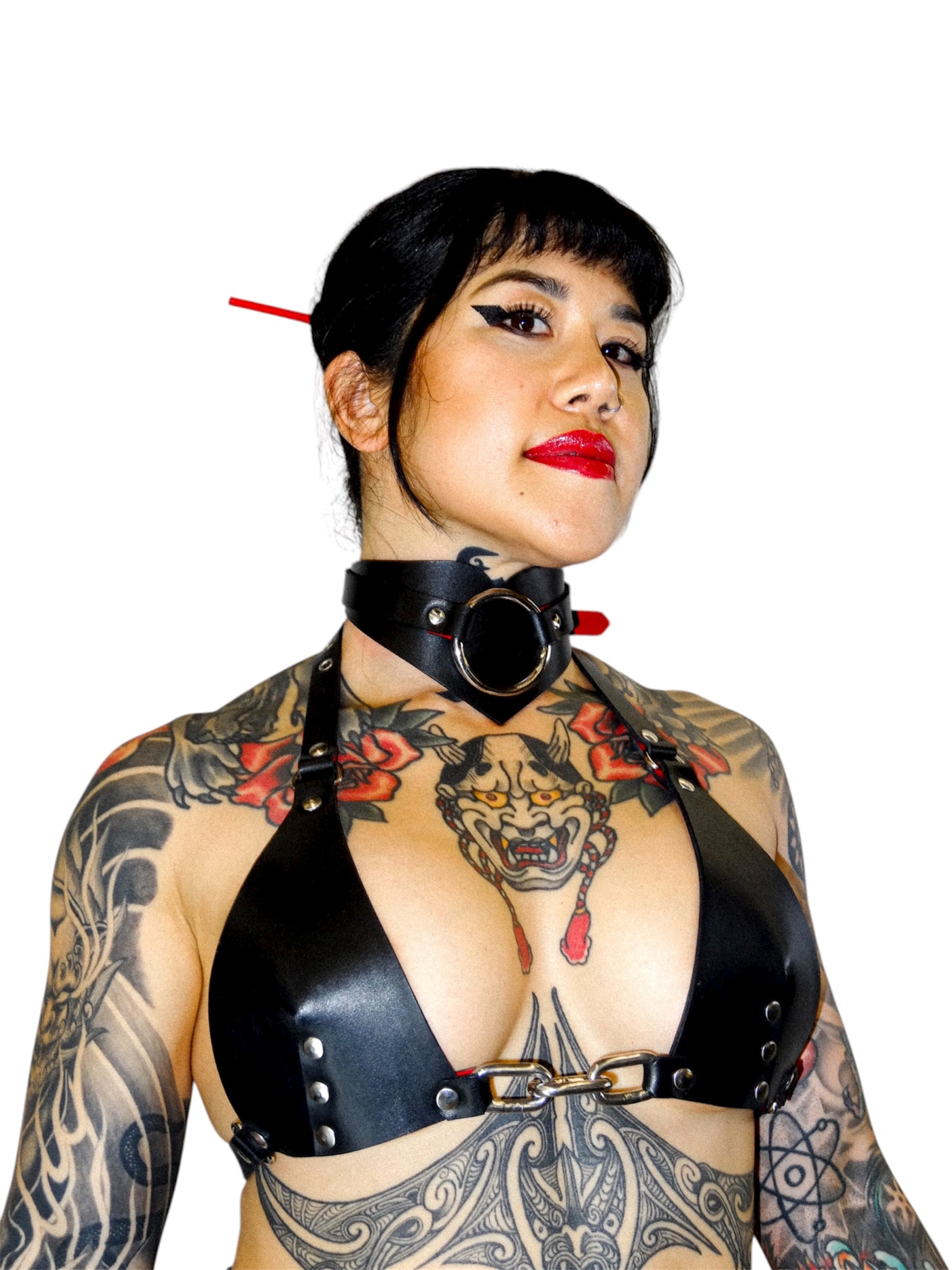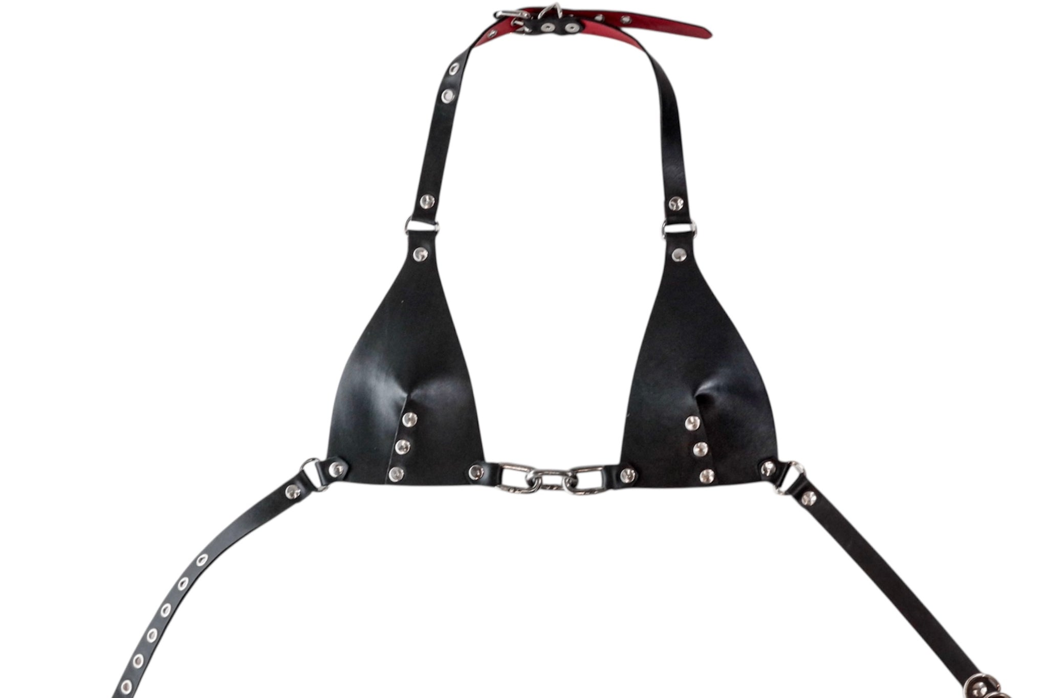 This Halter Bikini Top is made from supple cowhide with a satin gloss finish, lined with red leather and anchored in the front with stainless steel industrial chain links. The contoured form can accommodate and support a wide range of bust sizes, giving a firm secure fit.