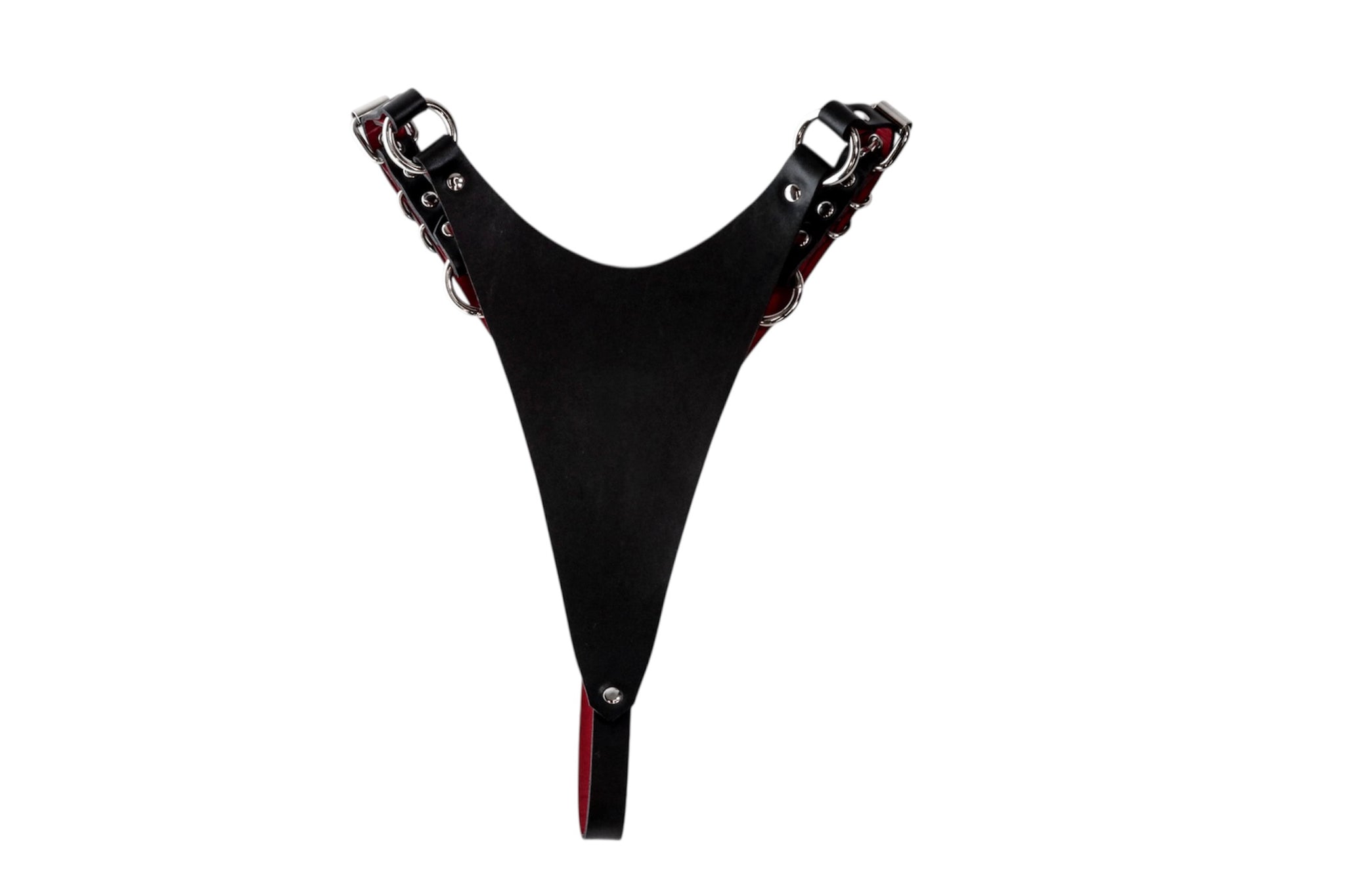 This Thong is made from supple cowhide with a satin gloss finish, lined with red leather. The side straps sit at waist height and connect to are adjustable centre strap at the back for easy customisation.