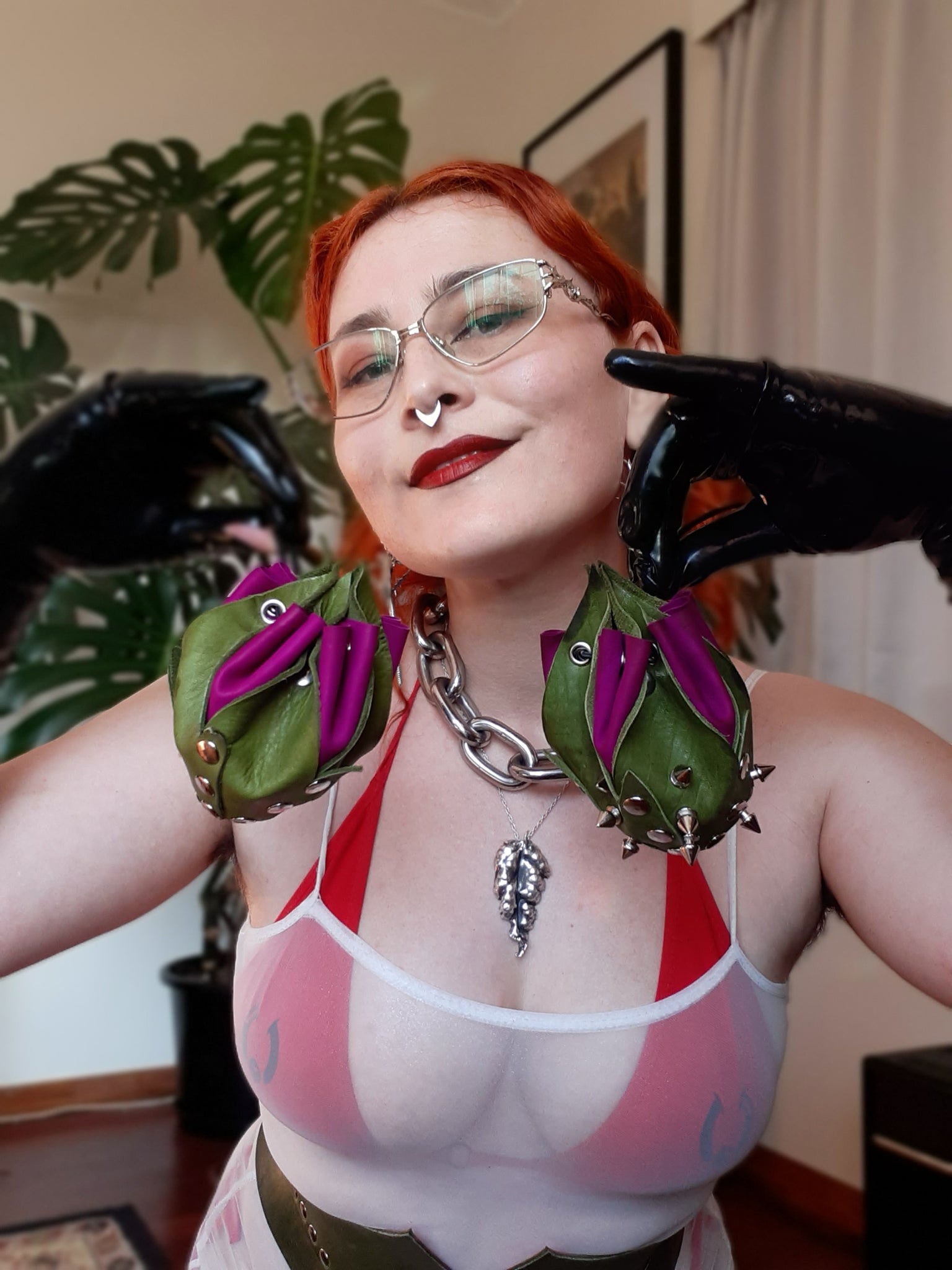 All hardware is nickel, and the chain is industrial grade stainless steel. Leather colour may fade or transfer.