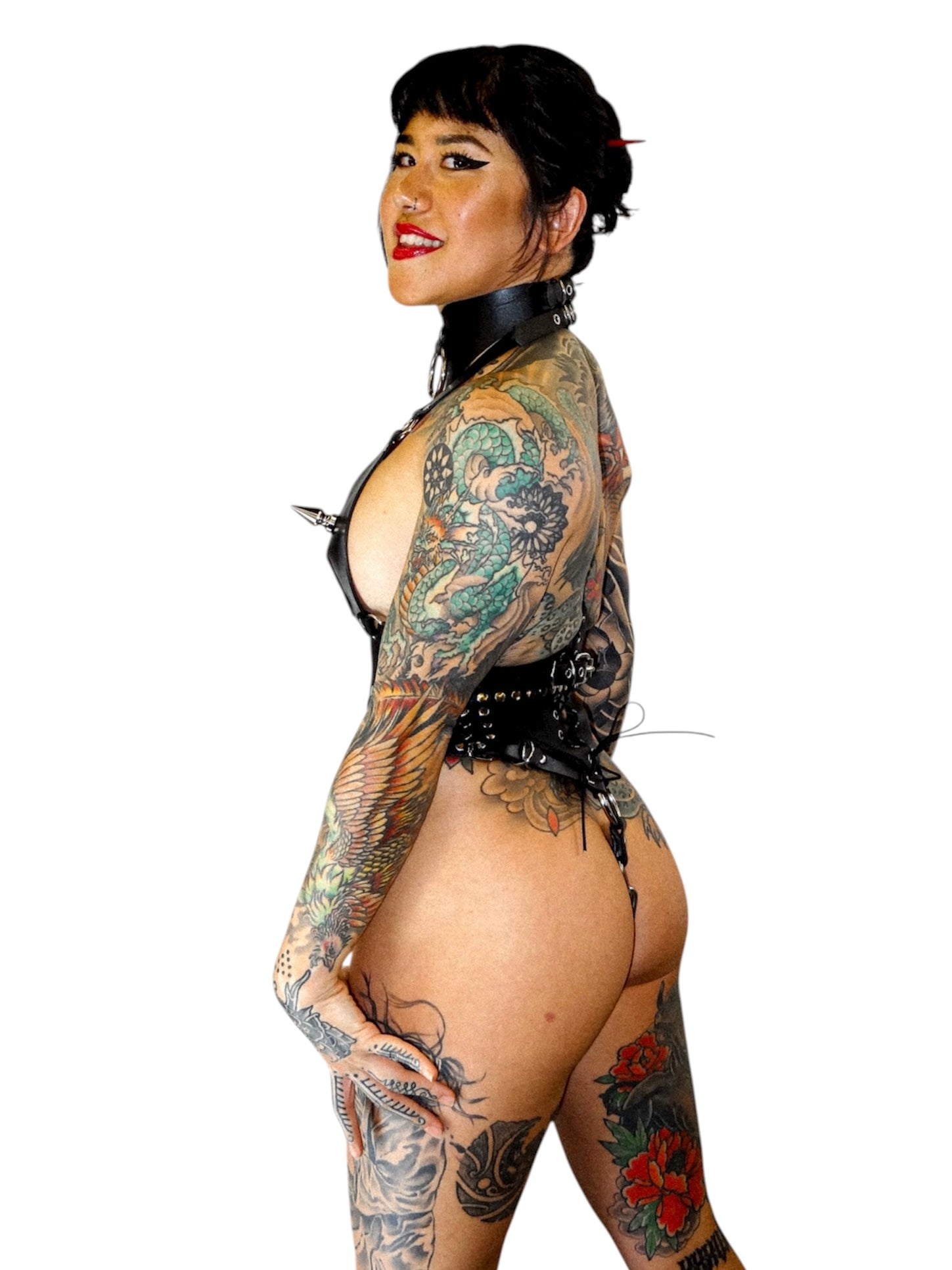 Waspie, dramatic and sharp, This Thorax Cincher is made from supple cowhide with a matte finish, lined with black leather and laced up with round elastic cord. The contoured form emphasises an hourglass figure without compressing the ribs, making it easy to move and breath compared to longer corsets.