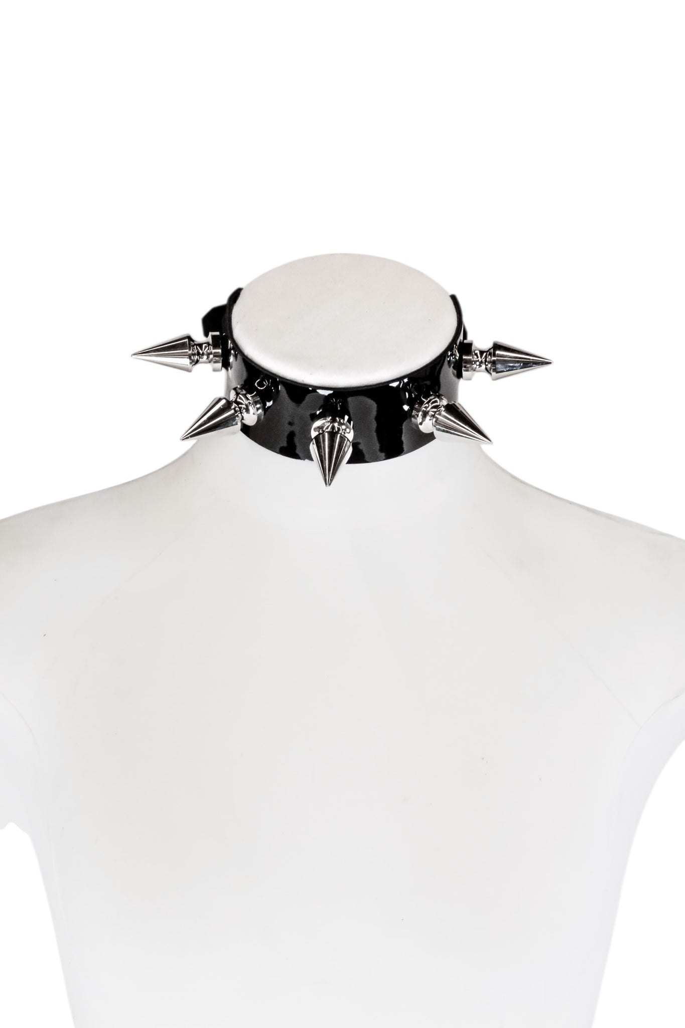 The choker is made with glossy black patent leather, with a silky smooth lining and buckle closure. Five 4cm long tree spikes add some weight. The slender back in this design allows you to move your neck freely.